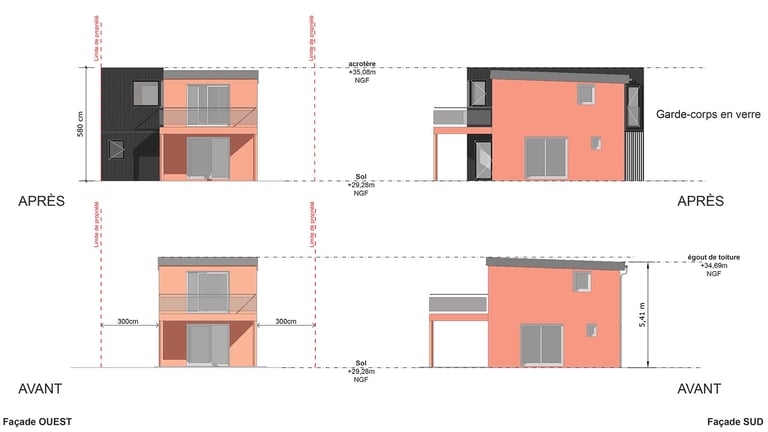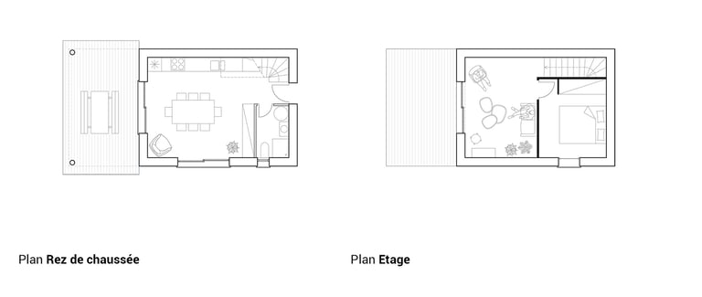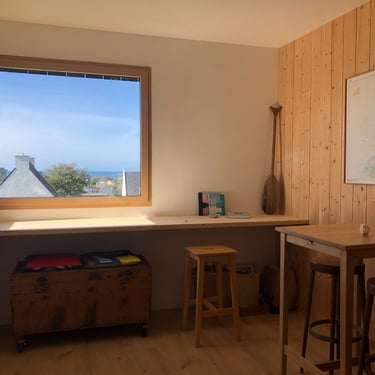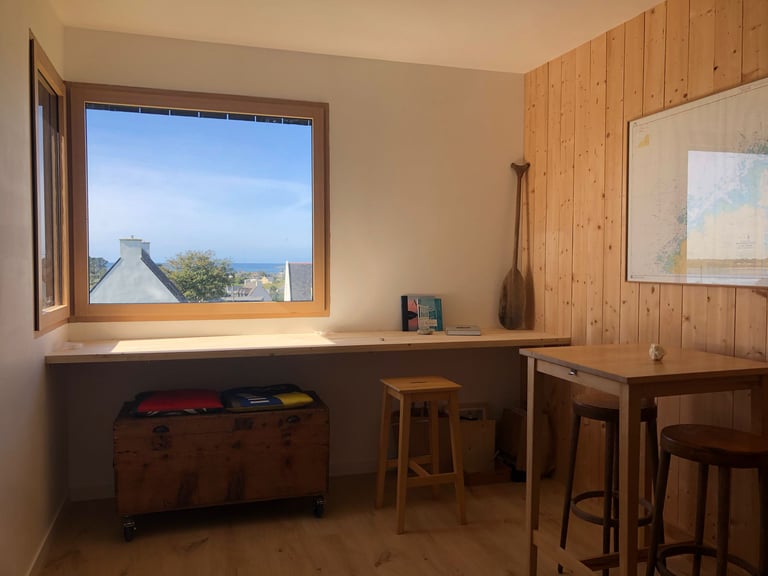 L’extension créée permet d’ouvrir une vue depuis la nouvelle chambre vers le Sud Est, tandis que le bureau qui prend place face à la fenêtre d’angle cadre avec l’aber Benoît au Sud Ouest. Le rez-de-chaussée accueille une buanderie accessible depuis la terrasse couverte, et qui communique avec un espace de garage.