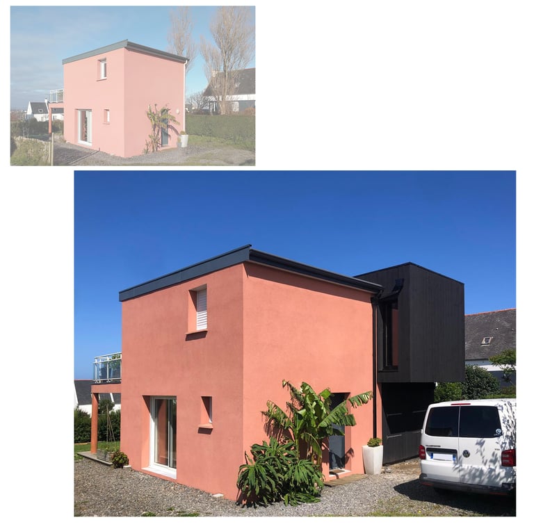 Cette petite maison de 45m² construite dans les années 2000 bénéficie d’une vue dégagée sur les abers. Son architecture cubique et sa couleur atypique dans le paysage appelaient à une extension qui vienne assoir le volume en lui donnant une direction. L’extension est réalisée en structure bois et bardage bois peint.