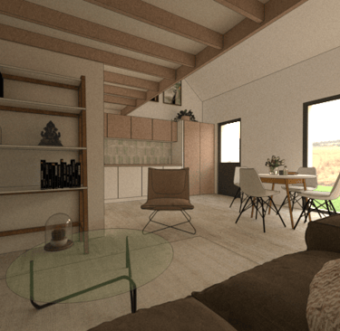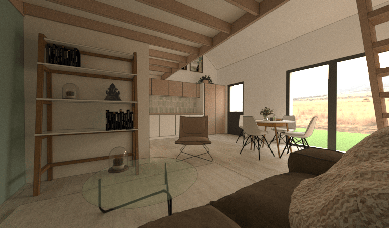 Destiné à accueillir deux à quatre personnes et permettre de garer 2 véhicules, le programme est rentré au chausse-pied en s'implantant sur 3 limites séparatives et concédant de s'ouvrir en façade Nord. La lumière pénètre toutefois par un châssis de toiture qui éclaire la mezzanine et le reste du volume.