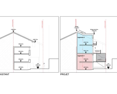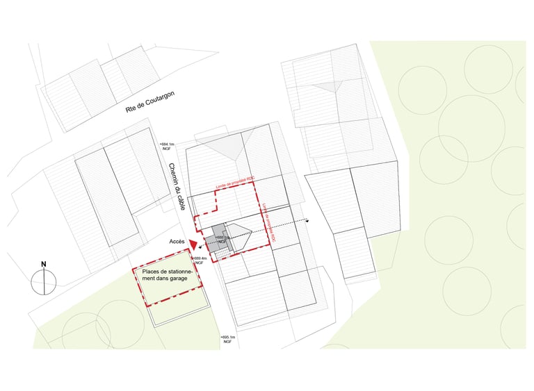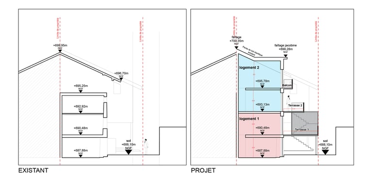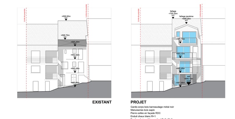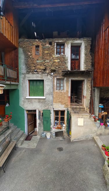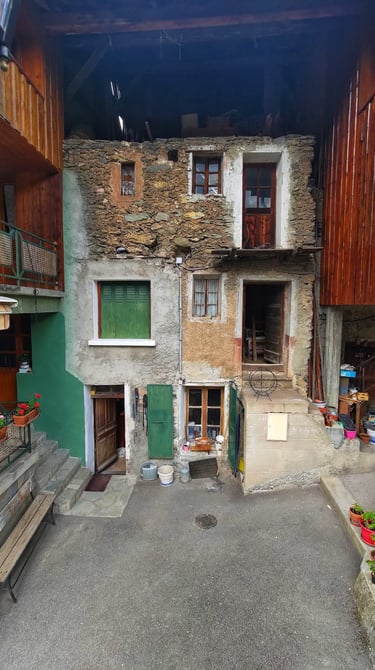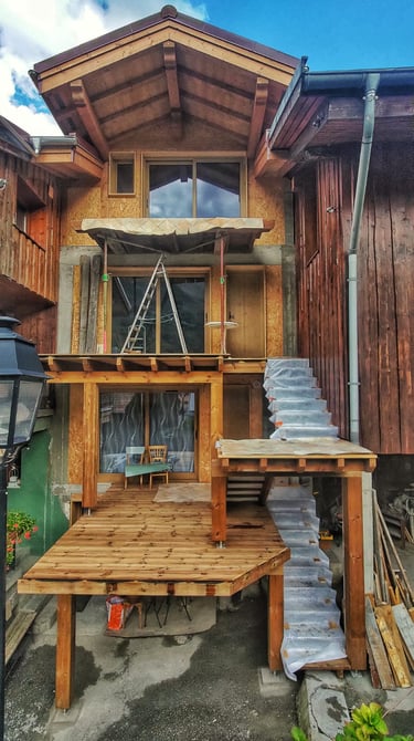 Niché au coeur du tissu dense du village de Villarlurin en Savoie, l’habitation vétuste a été débarrassée de sa façade et ses planchers pour recomposer des volumes sains et habitables qui accueillent deux T2 superposés avec leur terrasse.